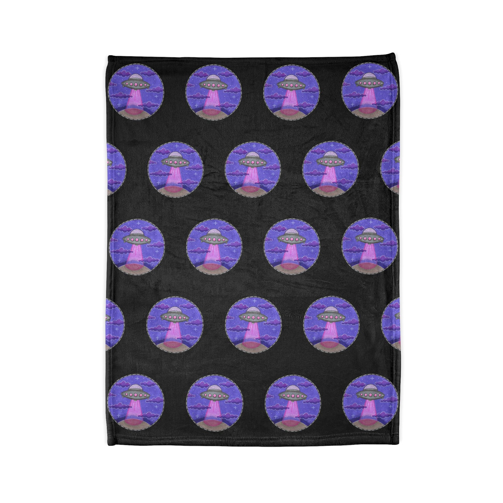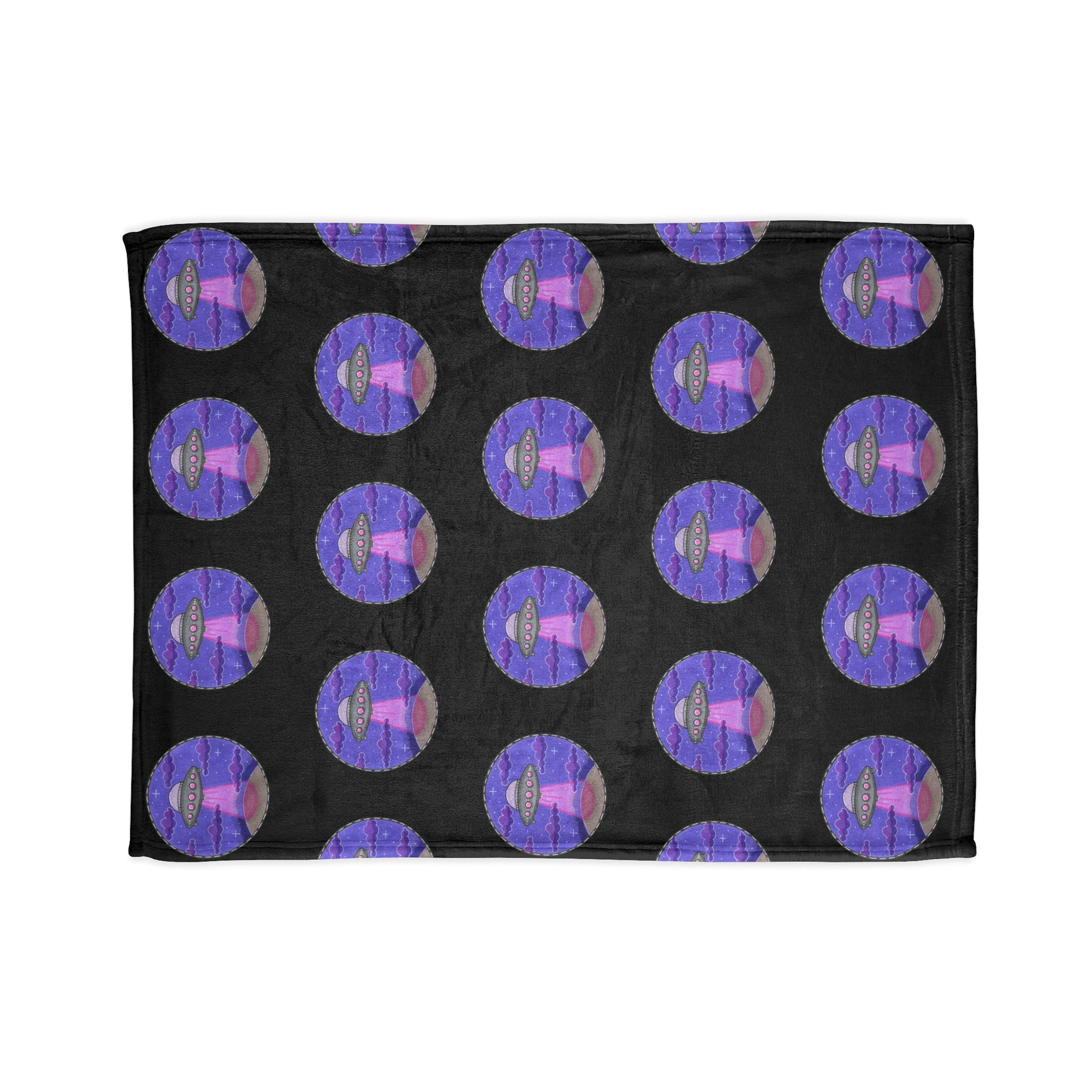 A plush polyester blanket printed with a repeating, whimsical UFO motif in purple and pink hues against a deep black background. Soft, thick fleece wraps you in warmth while the vivid, high-definition print keeps the playful design bright wash after wash. Lightweight enough for couch cuddles and substantial enough for cool evenings, this blanket adds a little cosmic charm to movie nights, late-night reading, or layering on a favorite chair. The hemmed edges and matched seam threads give a clean, finished look that holds up to everyday use. Available in three sizes and printed on one side, it’s an easy way to bring a quirky, otherworldly accent into a cosy space.