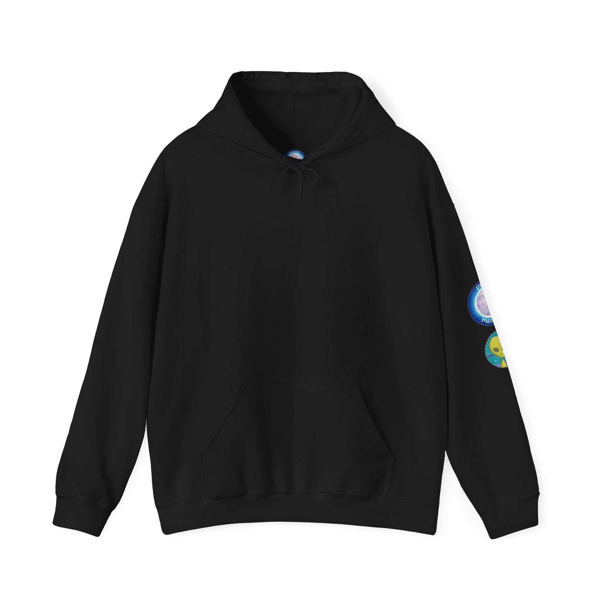 - Large circular back print featuring a whimsical alien scene with moons and stars