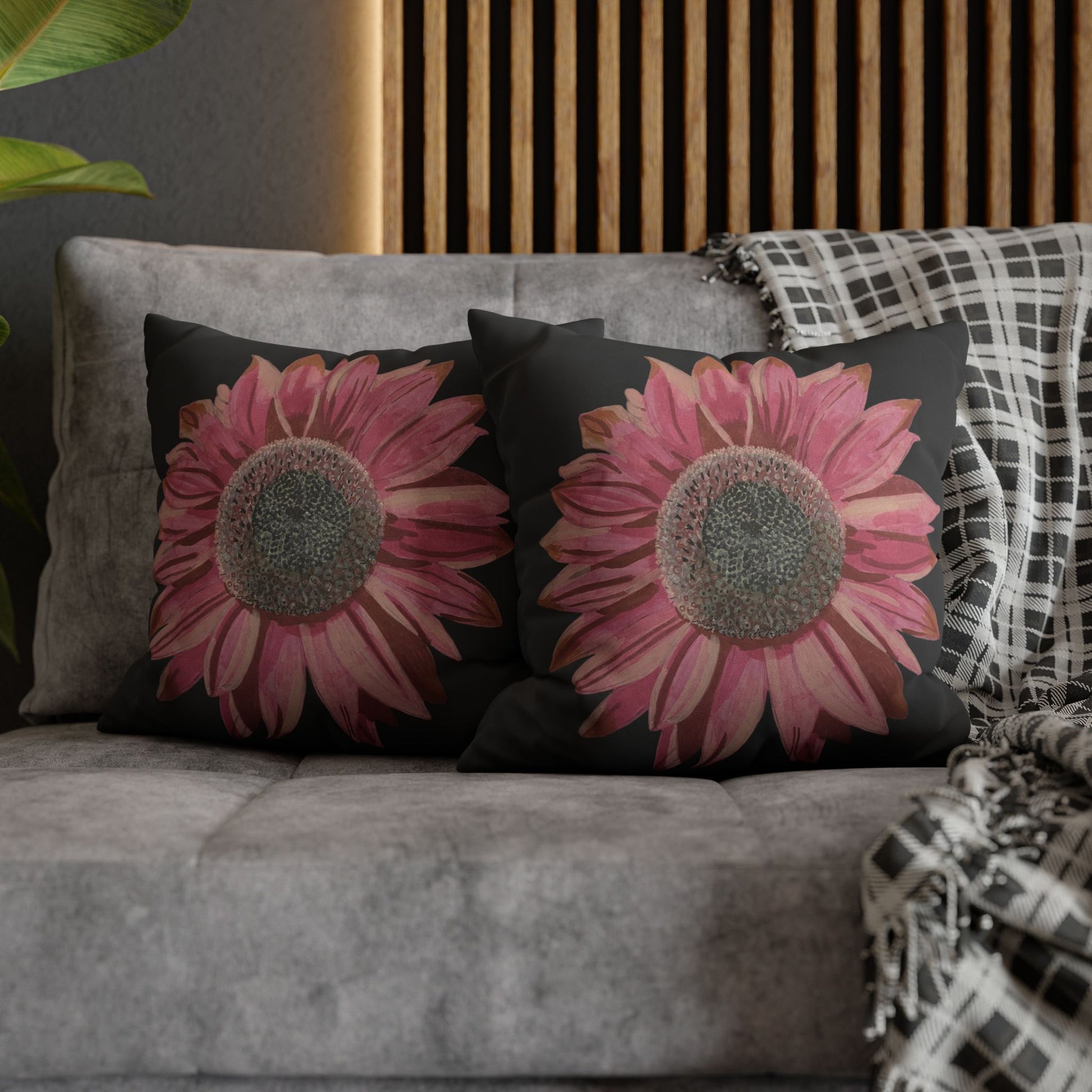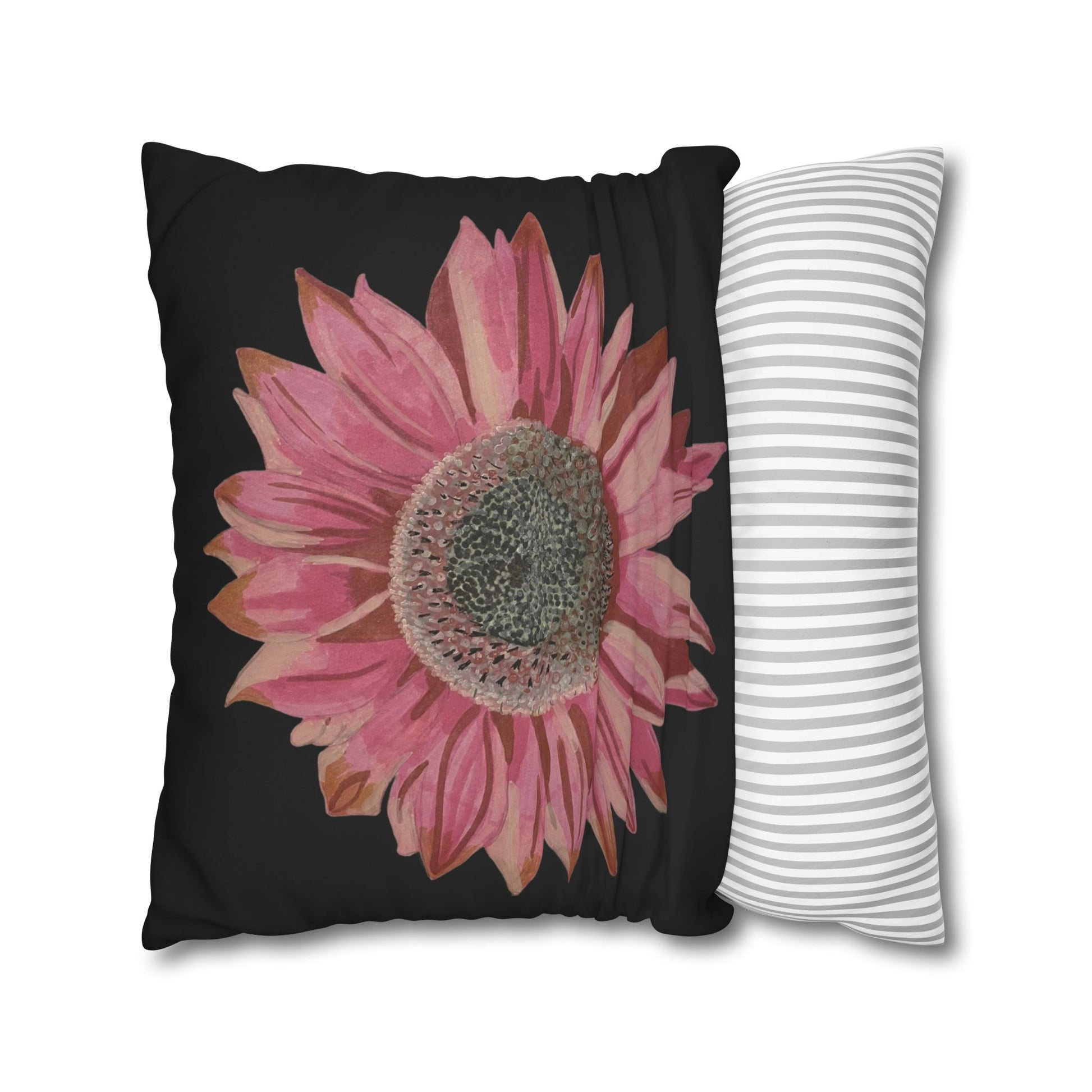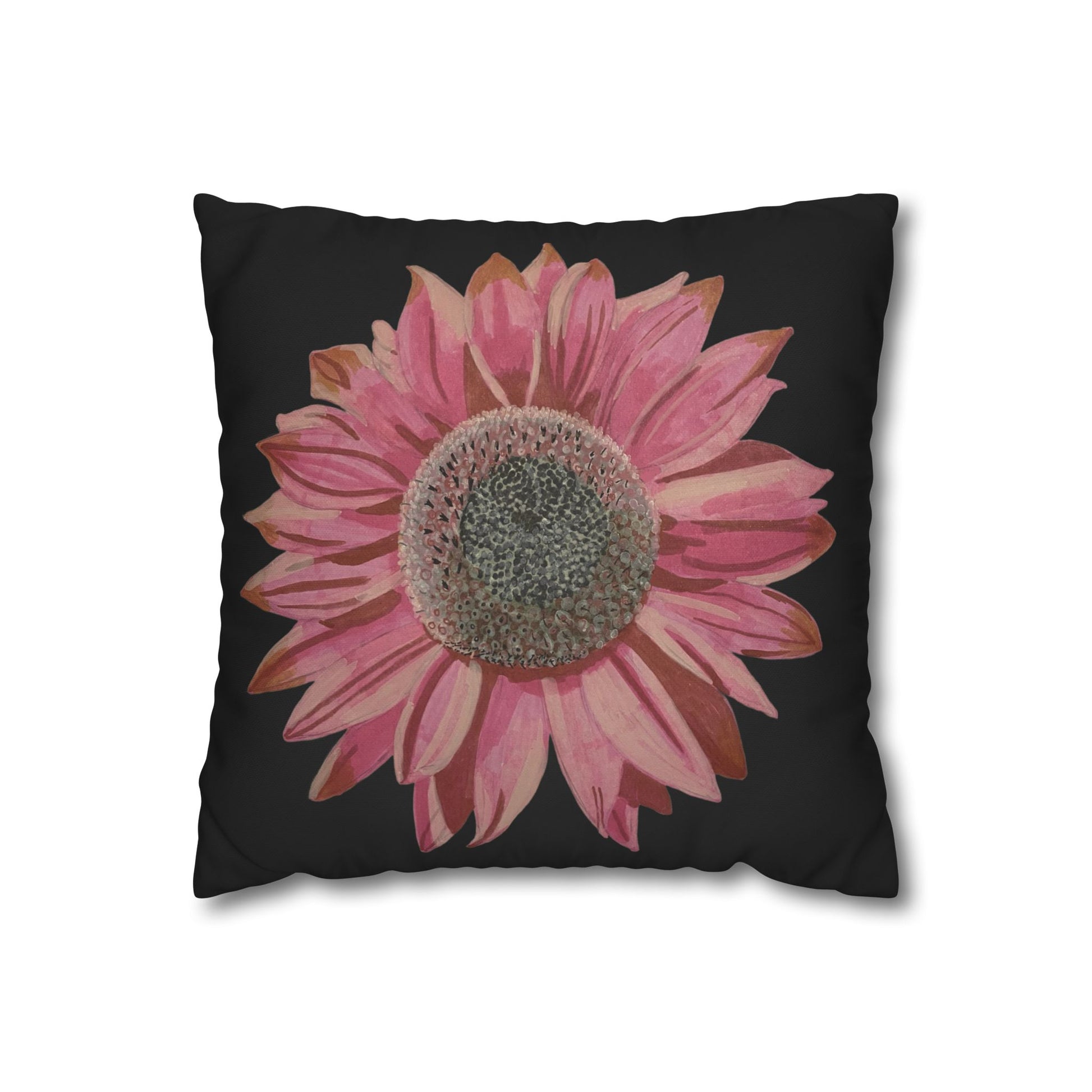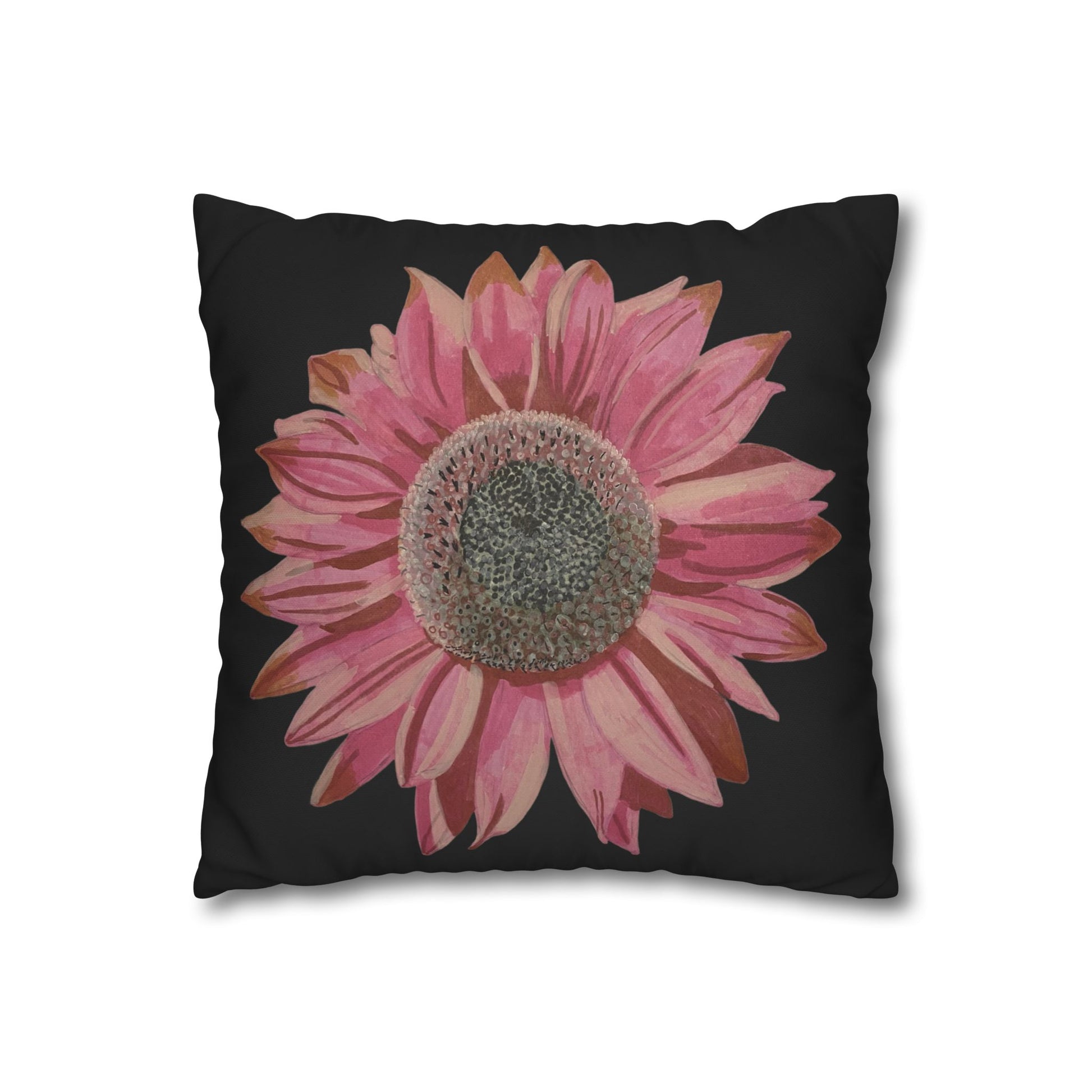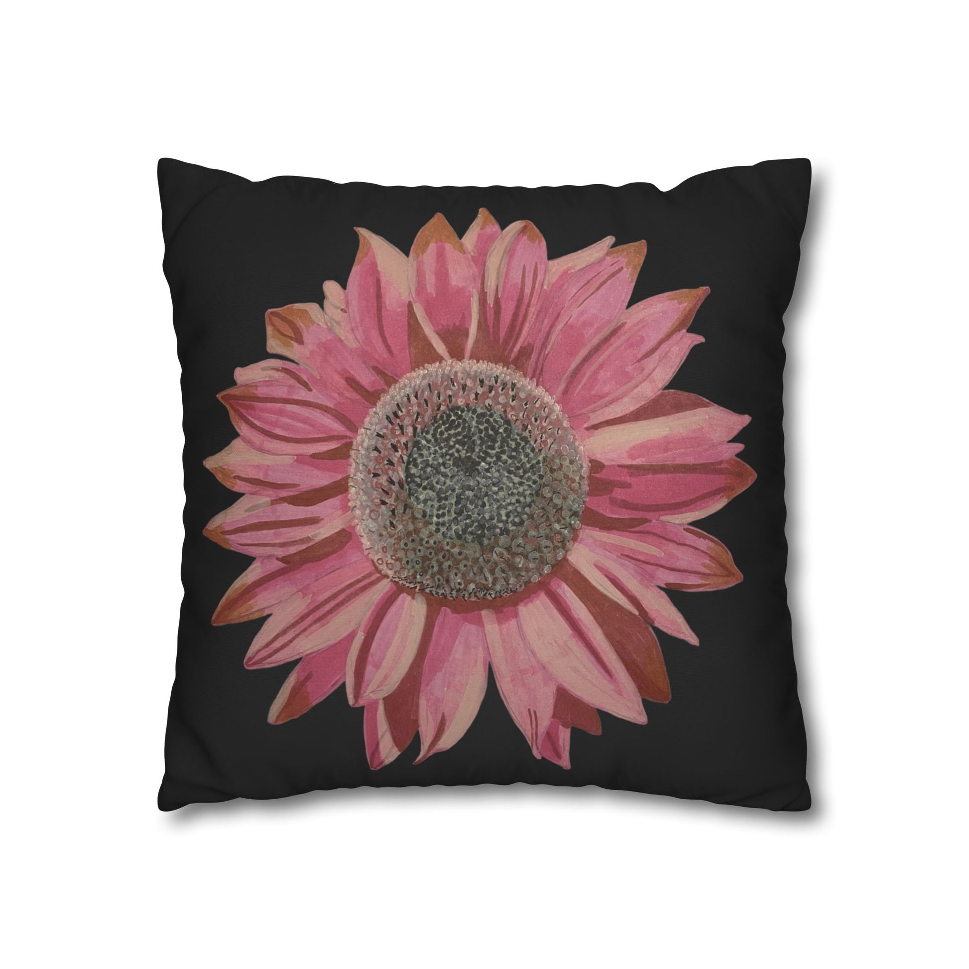Soft, artful, and quietly bold — this square poly canvas pillowcase brings a hand-painted sunflower in washed rose tones to brighten a favourite chair or cosy corner. The floral sits on a clean white field, letting the petals’ texture and subtle colour shifts take centre stage. It slips on easily via a concealed zipper and shows the artwork on both sides, so the design reads beautifully whether it’s propped on the sofa or layered on a bed. Lightweight and durable, the polyester canvas surface holds crisp, vibrant printing and keeps that slightly textured, painterly look that suits relaxed, creative spaces.