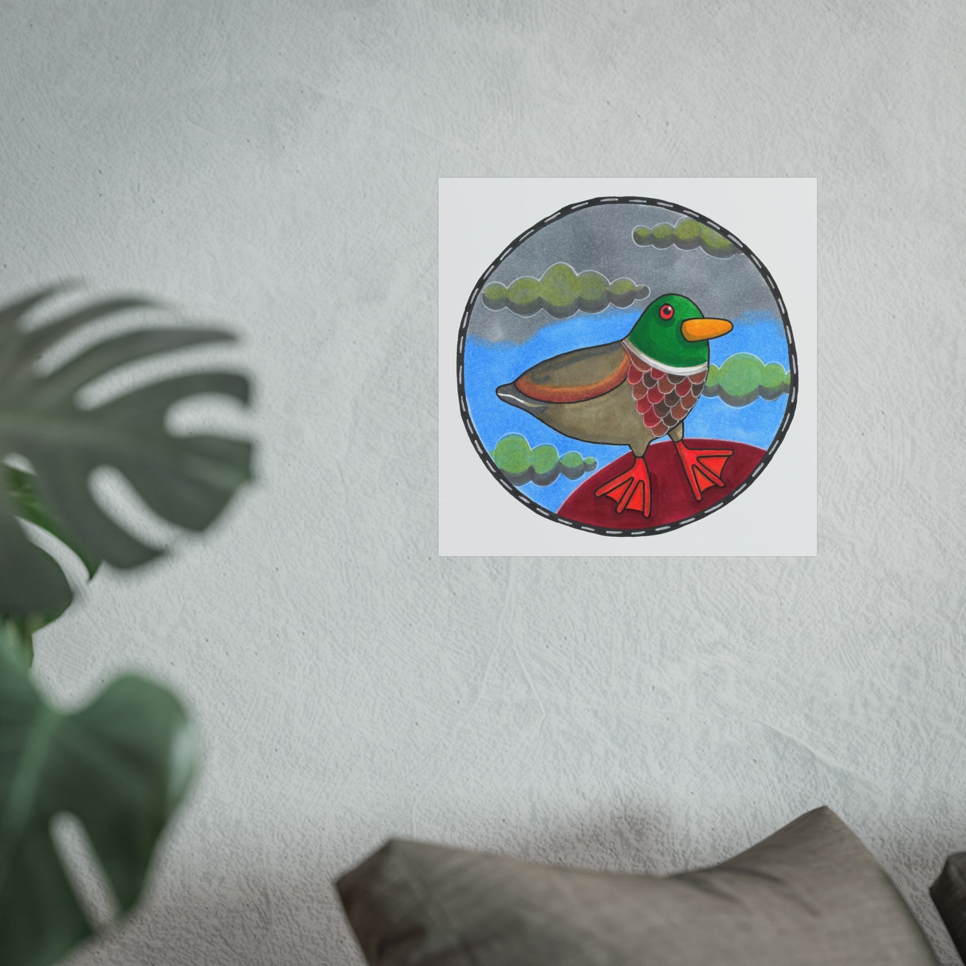 A bright, hand-drawn fine art poster that brings a playful, folk-art bird into any cozy corner. The giclée-quality print captures rich, matte colours and subtle texture on smooth, acid-free 220gsm paper, so the little duck’s layered feathers and cheerful green head read clearly from across the room. Framed or unframed, the round vignette and soft clouded background add a whimsical, homey touch — the kind of piece that makes a plain wall feel like a small scene from a favorite storybook. Available in horizontal, vertical, and square formats and multiple sizes to suit gallery walls, nurseries, kitchens, or a relaxed living room nook.
