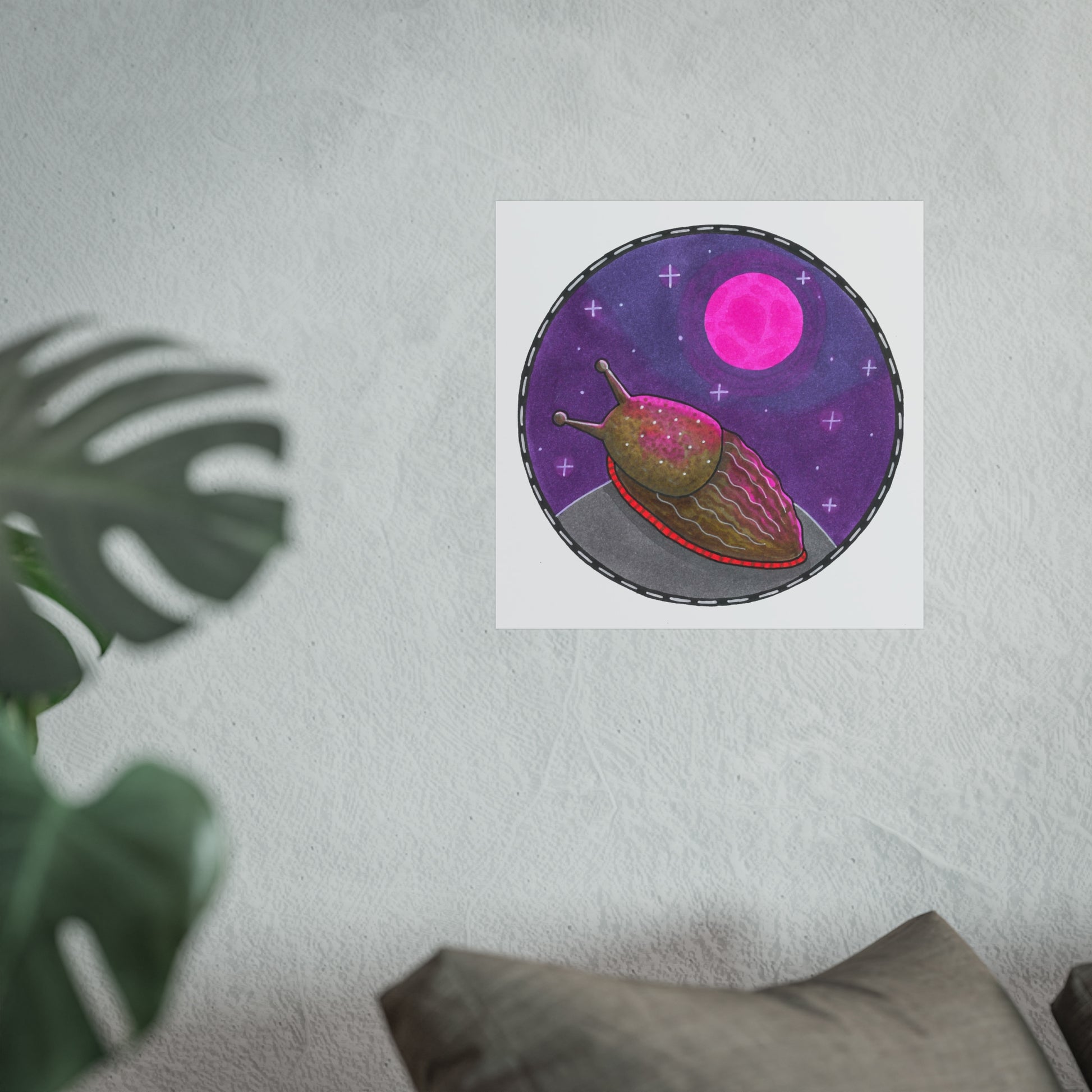 A dreamy fine art poster that captures a slow, cosmic moment: a glistening slug gazes toward a radiant pink moon against a deep violet sky speckled with tiny stars. The illustration blends whimsical, hand-drawn textures with rich giclée colour depth, creating a quietly surreal scene that feels both intimate and otherworldly. Printed on smooth, gallery-grade matte paper, the image holds its velvety tones while the crisp edges and subtle paper tooth bring out the original artwork’s charm. Hang it in a cosy nook, studio, or gallery wall to invite a pause — a gentle reminder to slow down and notice the small wonders of the night.
