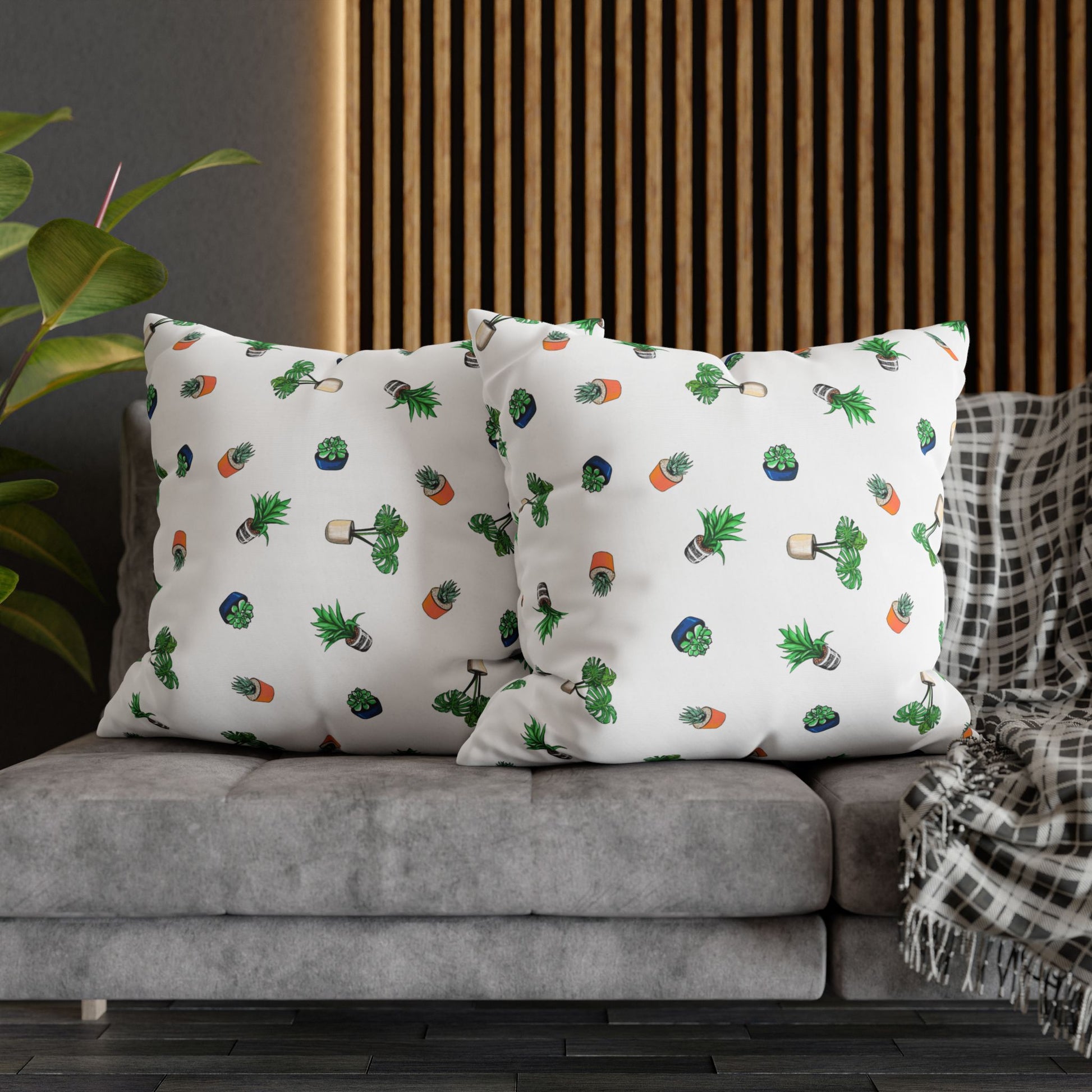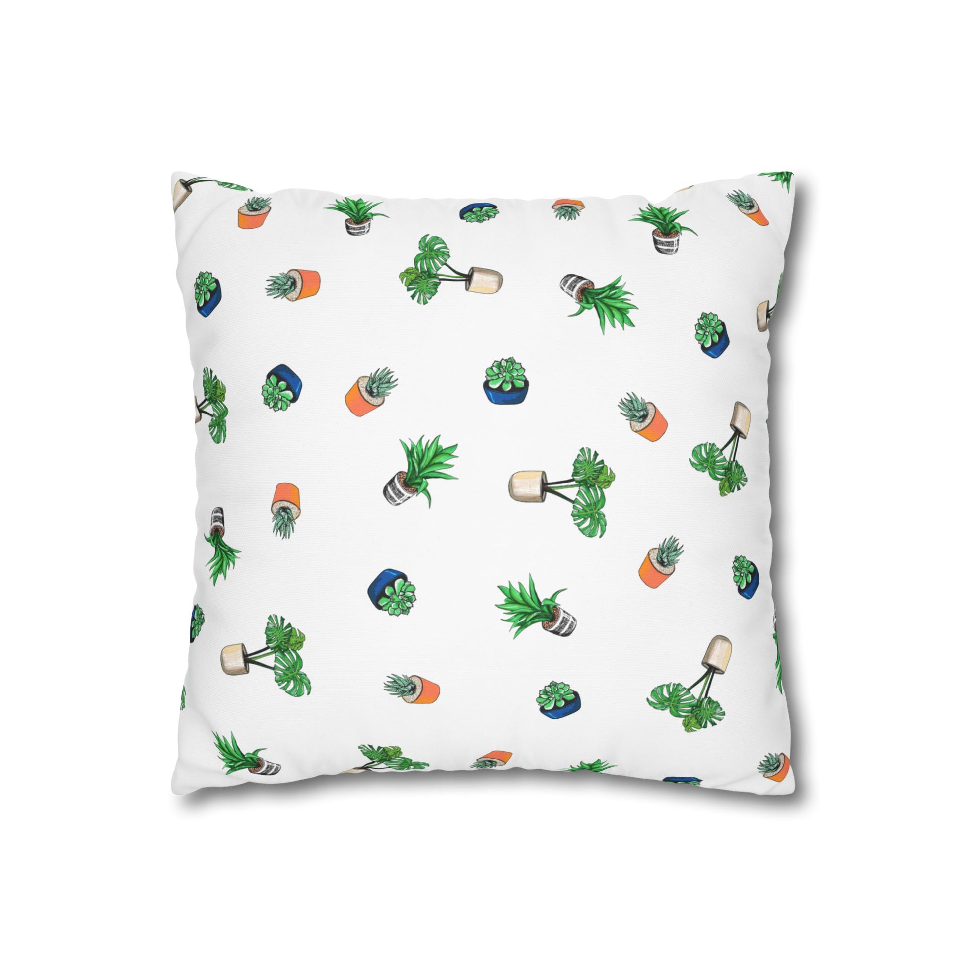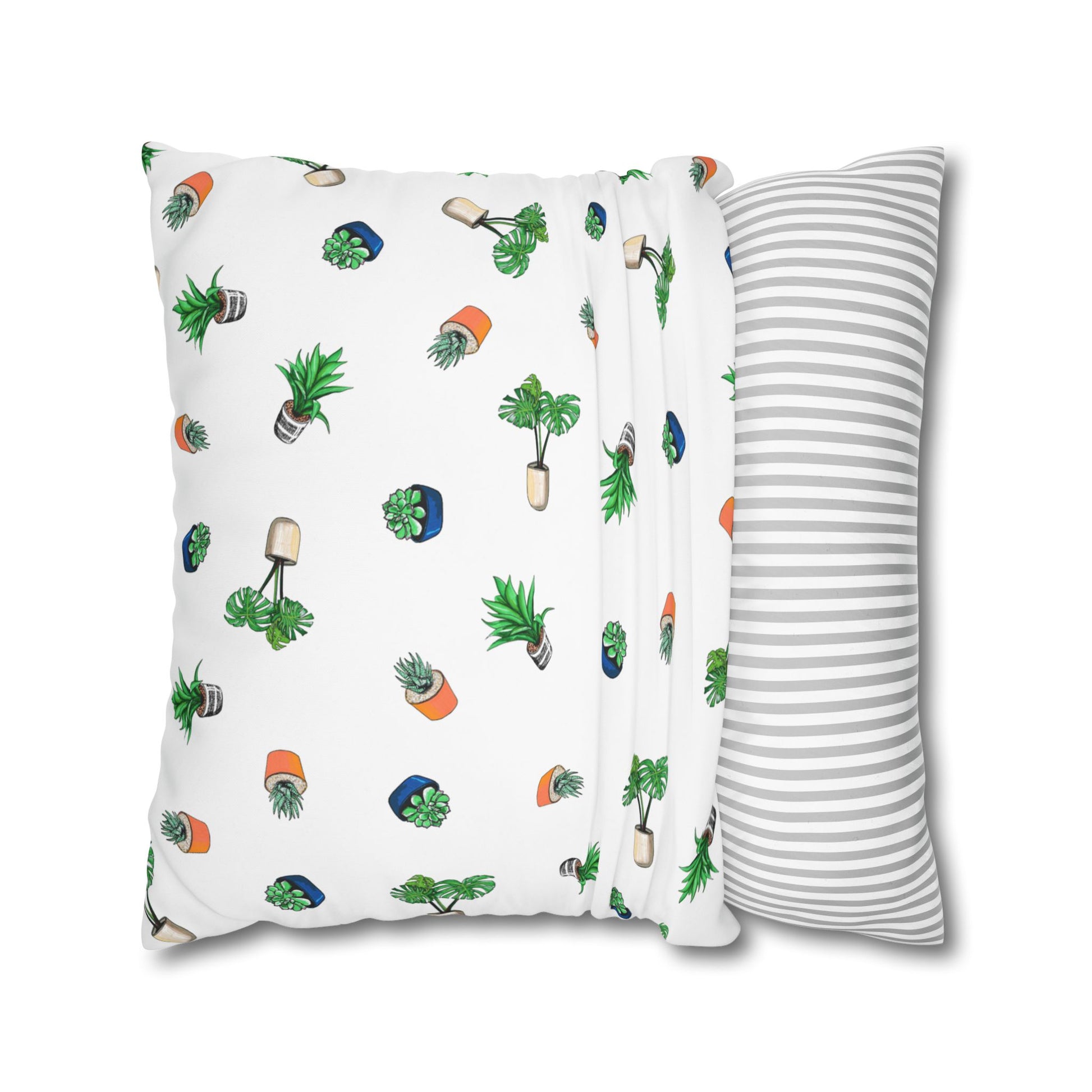 A soft, square canvas pillowcase printed on both sides with a playful scatter of potted plants and tiny garden tools. The fine-weave polyester feels smooth to the touch while holding bright, watercolor-like greens and warm terracotta tones that pop against the crisp white background. A concealed white metal zipper gives a clean edge and easy removal, while the durable fabric keeps the print lively through everyday use. This pillowcase slips over your insert (insert not included) to bring a light, botanical mood to a living room couch, sunlit reading nook, or a windowsill bench where plants and people gather.