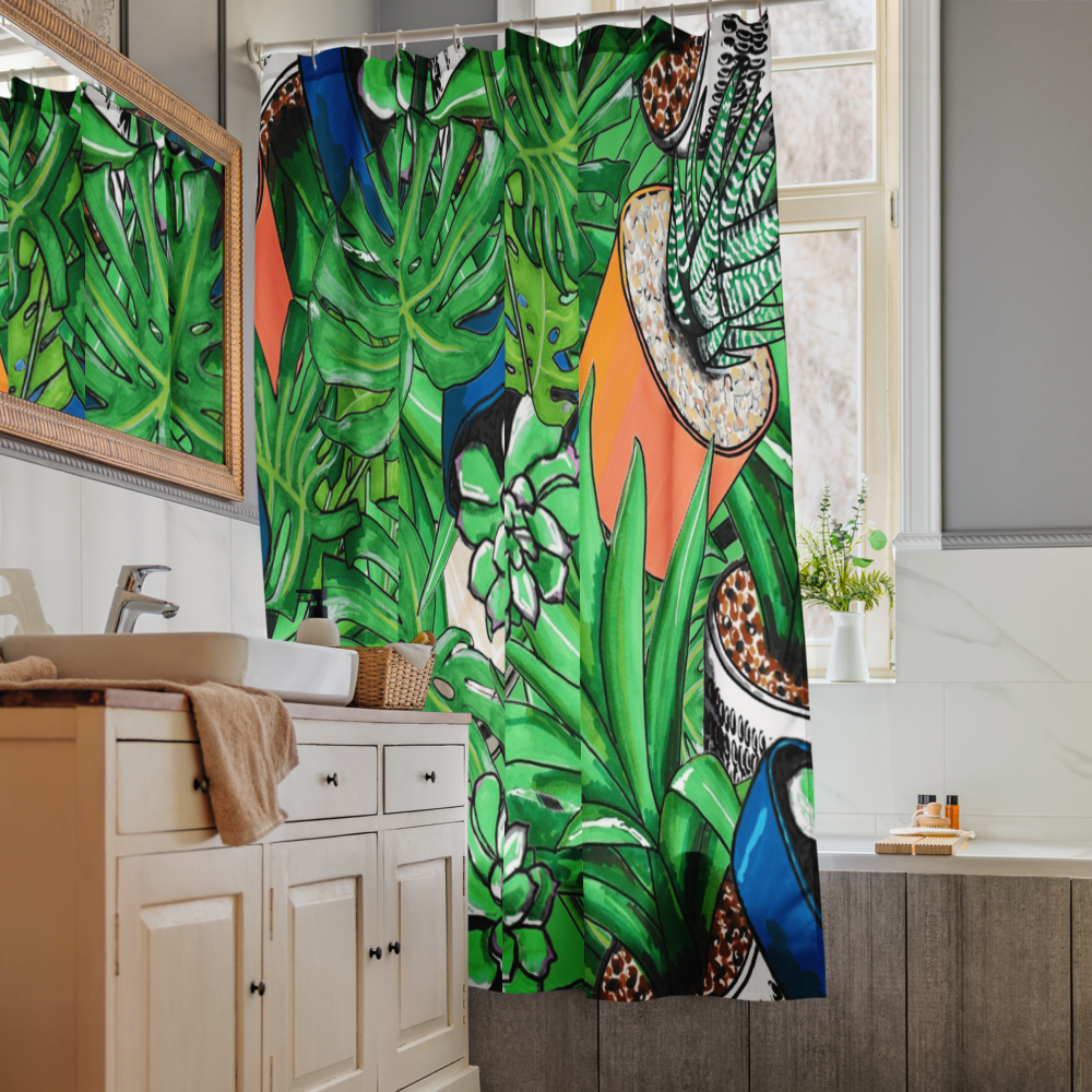 This hand-drawn botanical shower curtain features vibrant greenery, potted succulents, and bold jungle leaves designed to instantly refresh your space. Whether you’re styling a modern apartment, plant-filled oasis, or cozy guest bath, this statement piece adds color, personality, and spa-like energy to your daily routine.